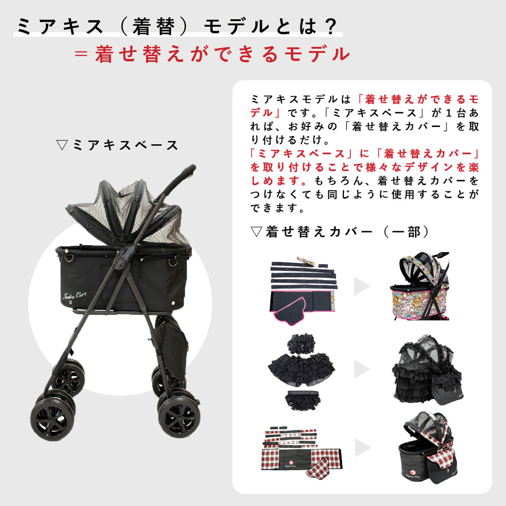 ミアキスとは犬猫の起源といわれる種。ミアキスから進化した多種多様な犬猫達。起源=ベースとなる「ミアキスモデル」はボディ本体にカバーを取り付けることで多種多様なデザインを手に入れることができるニューモデル。ノーマル(カバー無し)の状態でシンプルに使い回し易いシチュエーションを選ばないカート。ミアキスモデルは本体にお好みのカバーを簡単に着せ替えが可能!バッグ1つで色々なデザインの着せ替えカバーを楽しめます。 【御注意事項】